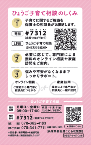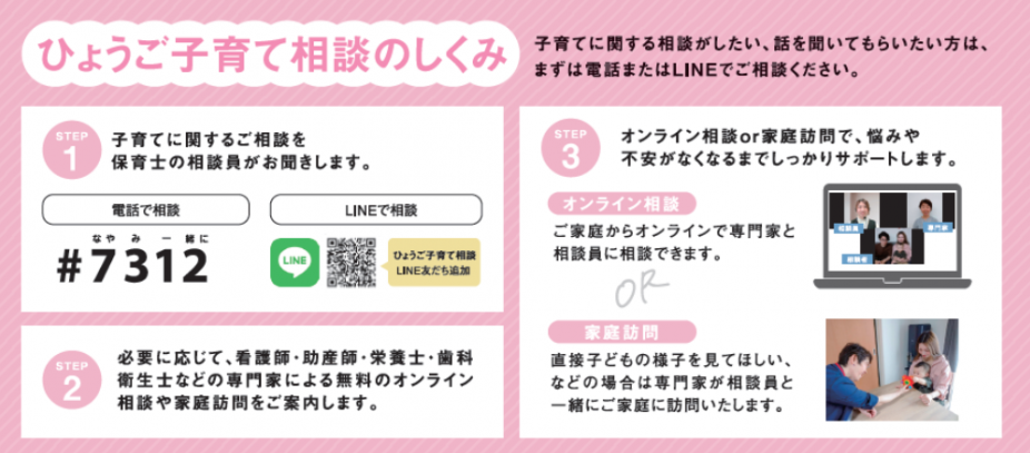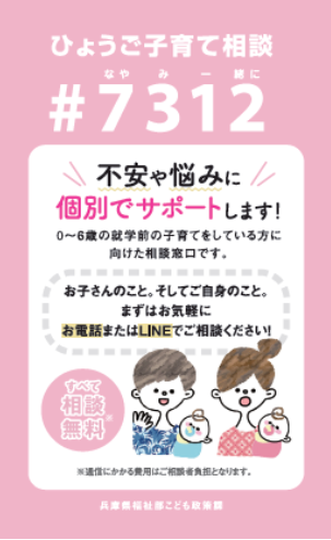『ひょうご子育てダイヤル#7312』や『ひょうご子育てLINE相談』まで、お気軽にご相談ください。