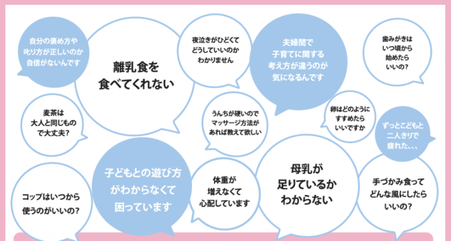 育児疲れ、授乳、こどもの発育・発達、離乳食、アレルギー、生活・遊び、しつけ、歯科・口腔衛生等の子育て相談に対応します。