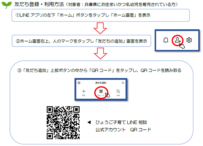 LINEアカウント「ひょうご子育てLINE相談」を友だち追加してください。