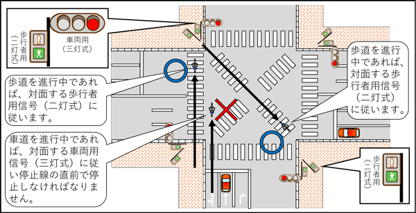 - すべての方向の自動車等を同時に停止させている間にすべての方向の歩行者等を同時に横断させる方式であって、斜め方向の横断を認めている交差点です。