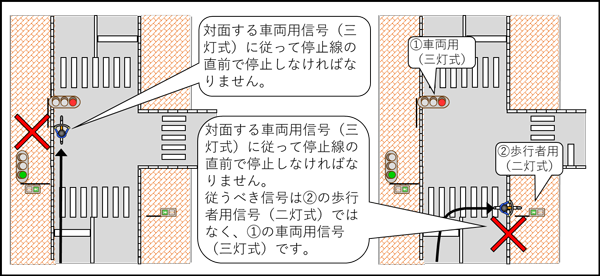 - 同一方向の信号であっても車両用(三灯式)と歩行者用(二灯式)で表示される灯火が異なりますので、従うべき信号がどれになるのかを特に注意する必要があります。
