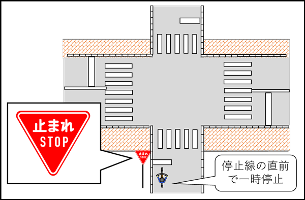 - 一時停止標識のある交差点では、停止線の直前(停止線がなければ交差点の直前)で一時停止しなければなりません。