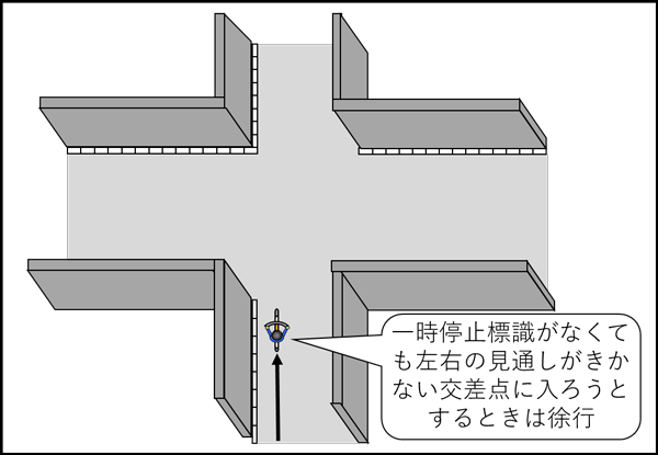 自転車は他の車両と同様に左右の見通しがきかない交差点に入ろうとするときは、徐行しなければなりません。