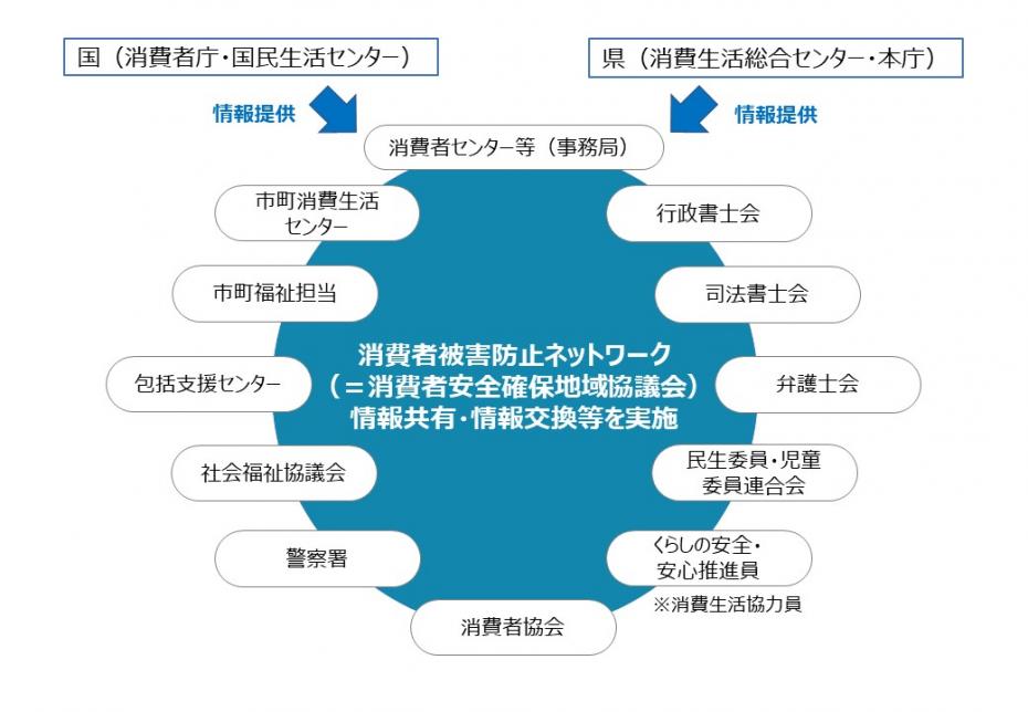 消費者被害の現状や対処方法等の情報共有・意見交換のため、平成15年度から県内7地域の消費生活センター等ごとに、管内市町、弁護士会や民生委員等を構成員とする「高齢者等消費者被害防止ネットワーク」を設置し、地域に応じた取組みを推進しています。(平成30年度から同ネットワークを「消費者安全確保地域協議会」として位置づけ)