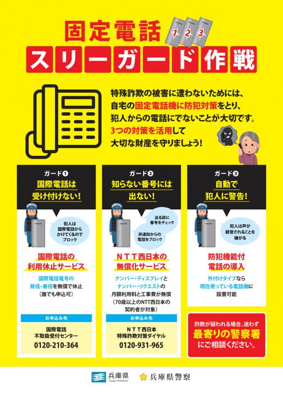 兵庫県警察では、特殊詐欺の犯人からかかってくる電話に応答しないための3つの対策「固定電話スリーガード作戦(外部サイトへリンク)」を推進しています。