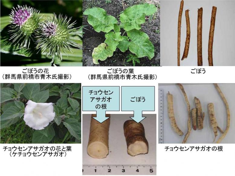 チョウセンアサガオとゴボウの花と葉は見違えることはないと思いますが、根はよく似ています。地上部が枯れた時期には間違って採取される可能性があります。(「ごぼう」はふつうは開花前に採取されるため、ごぼうの花を目にすることはあまりありません。)