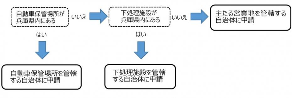 例2:自動車保管場所が兵庫県外にあり、下処理施設が神戸市内にある場合は、手続き先は原則として神戸市保健所になります。