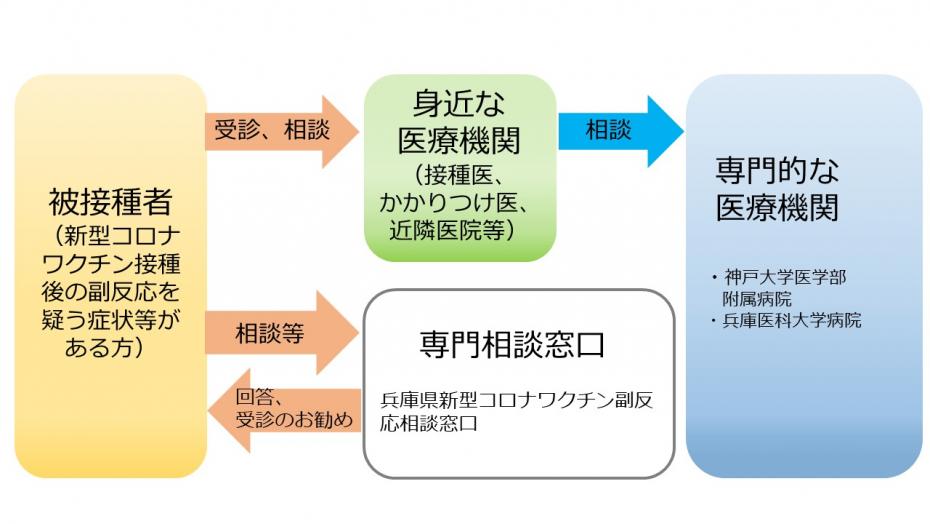 なお、専門的な医療機関への相談は、副反応を疑う症状等を診察した県内の医療機関からのみとしています。専門的な医療機関では、個人からの相談には対応できませんので、副反応等の気になる症状があれば、まずは接種医やかかりつけ医等の身近な医療機関に相談受診してください。