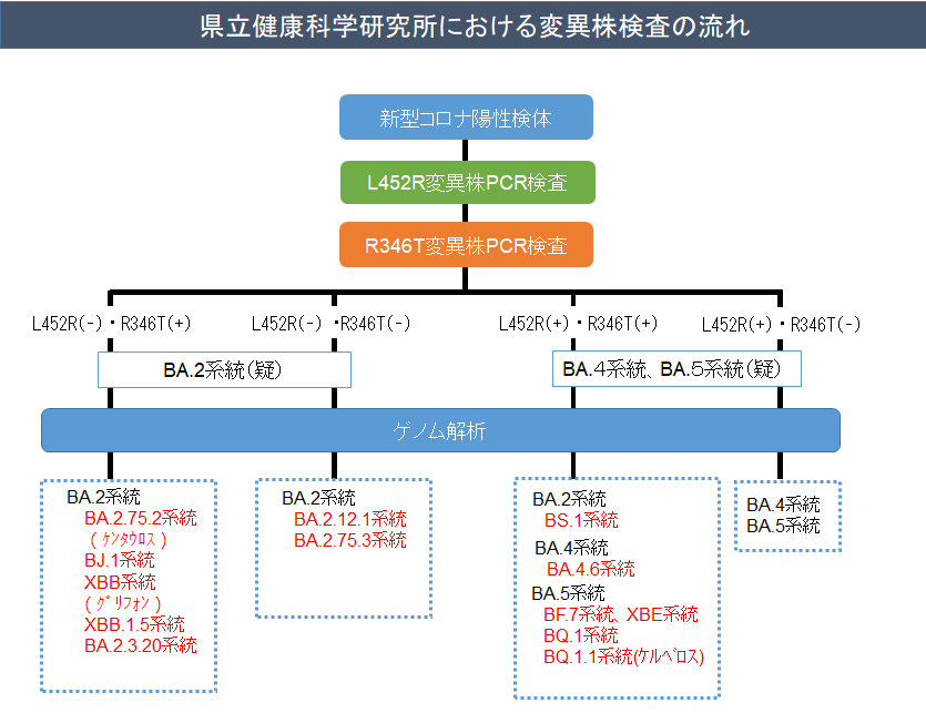 県立健康科学研究所において、ゲノム解析のスクリーニング検査のために、特徴的な変異である「R346T」変異株PCR検査を実施(令和4年10月28日から)しています。