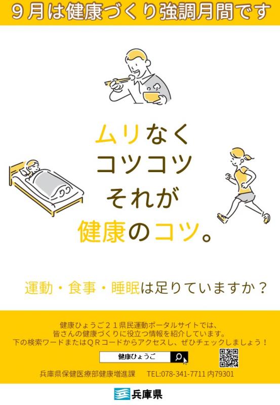 兵庫県では、9月1日を「県民健康デー」、9月1日~9月30日を「健康づくり強調月間」に設定し、健康づくりに関する普及啓発を実施しています。