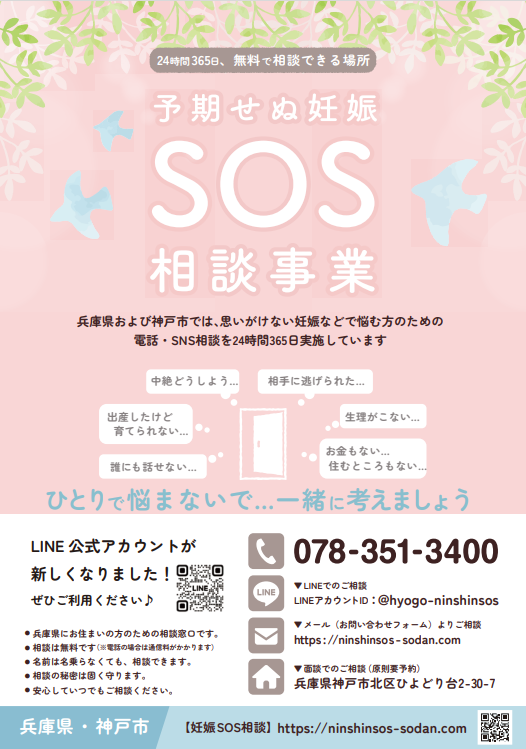 <相談受付>メール、LINE相談は随時受付けます。 アカウント:@hyogo-ninshinsos ※令和6年9月1日からアカウントが新しくなりました |