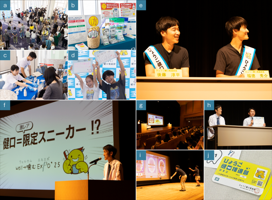 (a)会場は満員御礼!(b)(c)ロビーには協力企業による様々なブースも。災害時に水がなくても使える液体歯みがきの紹介や、60秒あれば歯周病のリスクを判定してくれるキットの体験などなどが並びました。(d)フォトブースも設置。沢山の方が「#わたしの健口」について書いたボードを持って撮影してくれました。(e)イベントはジャルジャルのお二人のスペシャルコントでスタート。ひとしきり笑ったあとは、お二人と一緒に健口について学ぶ時間です。(f)(g)講師は坂中哲人先生。「健口=激レア限定スニーカー!?」など、面白く、聞きやすいお話は来場者に大人気。(h)齋藤知事と坂中先生がそれぞれの「#わたしの健口」について語る一幕も。(i)ジャルジャルのお二人が体を張った最新歯みがきゲームに挑戦!激闘の末、後藤さんの勝利!(j)ジャルジャルが部長の「ひょうご健口推進部」部員証や、スタンプラリーで手に入る会場限定グッズも配布しました。
