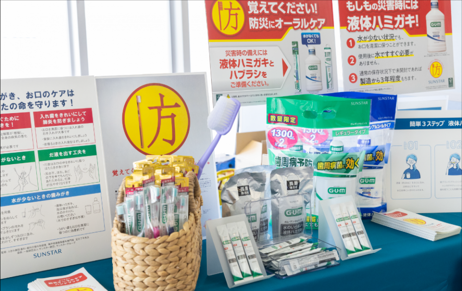 被災時に水なしでも歯みがきできる液体歯みがきを展示。