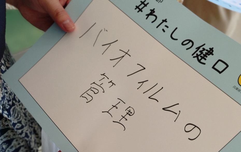 「ジャルジャルが好きなんで来ました。面白かった。ネタやってくれると思ってへんかって。今日は健口推進部長(ジャルジャル)の後輩部員として聞きましたよ。でも一番耳に残ったのは大阪大学の坂中先生の話の「バイオフィルムの管理」やったんで、健口ボードにその言葉をそのまま書きました。なんか、先生がおもろかった。説明の仕方も。日頃、歯医者さんに怒られんように行く前だけフロス使っているんですが、やっぱバレますよね。バイオフィルムの管理のためにちゃんとみがいて、フロス続けようかな。奥さんも『使いや』って言ってくれるし」