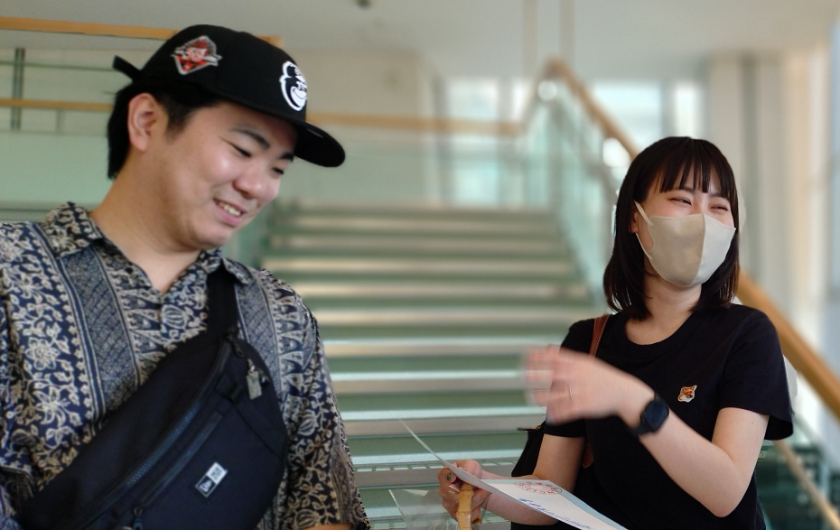 「ジャルジャル、好きです。僕たち、昨年の前笑戦から来ています。ジャルジャルが部長をしている、ひょうご健口推進部の部員証もちゃんと持ってますもん。部員証をちゃんとスマホケースに入れて、ね。前笑戦も面白かったから、今日も楽しみです」