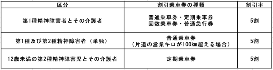 旅客鉄道株式会社等旅客運賃減額「第1種」または「第2種」の記載がある精神障害者保健福祉手帳をお持ちの方
