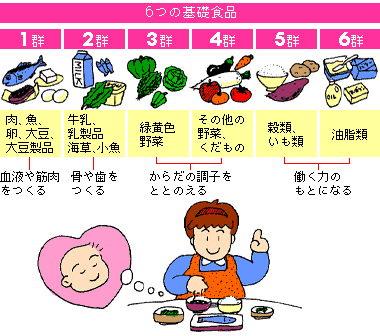 離乳食をつくる時も、食品の分類と体内作用を念頭に、いろいろな食品を組み合わせて栄養のバランスをとるようにつとめるとともに、あくまでも赤ちゃんの心身の発達や健康状態に応じて行うことが大切です。