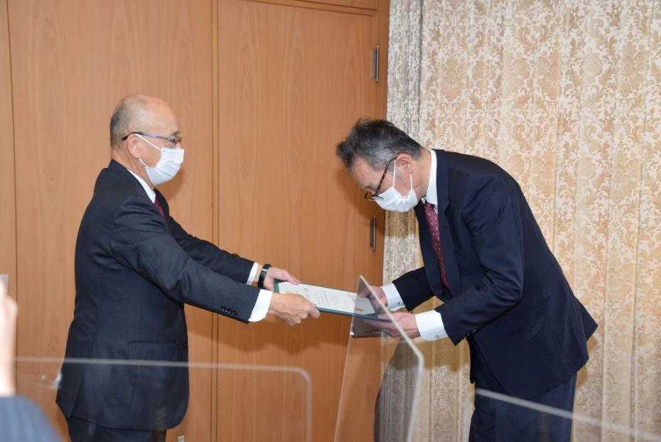 片山副知事(左)からひょうご認知症希望大使の古屋氏へ委嘱状を手交 |