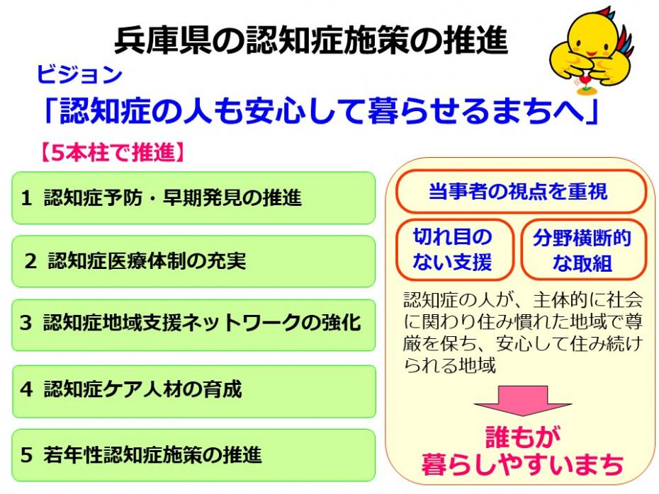 兵庫県においても、これらを踏まえ、「認知症予防・早期発見の推進」「認知症医療体制の充実」「認知症地域支援ネットワークの強化」「認知症ケア人材の育成」「若年性認知症施策の推進」の5本柱により、認知症の人やその家族の視点に立った総合的な取組を推進しています。
