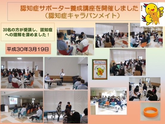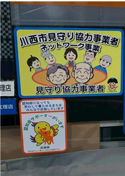 NPO法人播磨オレンジパートナーの呼びかけで、たつの市の城下町周辺にある個人経営の店主らが認知症サポーター養成講座を受講し、ステッカーを、地域住民や観光客の目に触れる店先に貼っています。オレンジリングをエプロンに付けて仕事をしたり、城下町でイベントがある際に認知症の方向けの休憩所を設けたり、店舗ごとの工夫もしています。29年度も認知症サポーターが多くの店舗で養成されました。