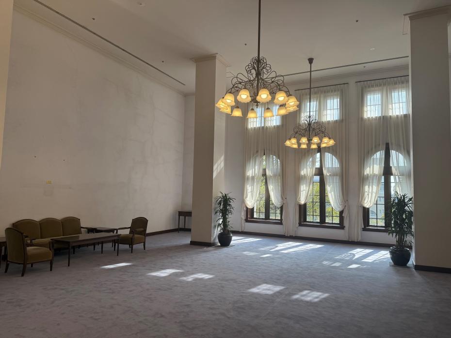 南玄関から入ってエレベーターで3階に上がると、かつて正庁と呼ばれ、式典や儀式を行った天井の高い部分を活用したロビーがあります。現在は、海外要人をお迎えする場として、また、西側の壁面には小磯良平画伯のタペストリーがあり、式典後の記念撮影の場などに利用しています。