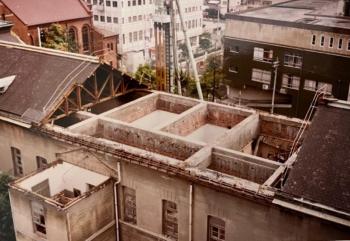 1985年の迎賓館への改築時の写真で、赤レンガを組み上げて外壁や内壁を造る組積(そせき)構造を確認することができます。