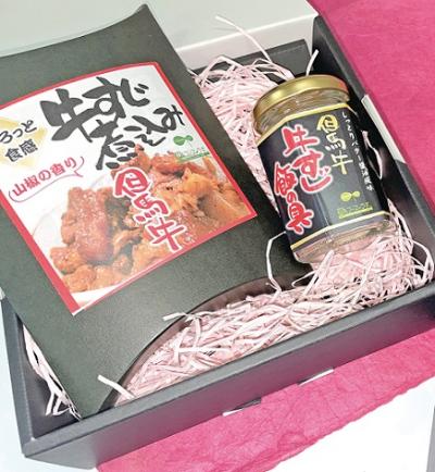 独自の調理法で但馬牛のすじ肉をおいしく仕上げた牛すじ煮込み(250g)と牛すじ飯の具(140g)のセット。五つ星ひょうご選定商品です。2,000円。 |