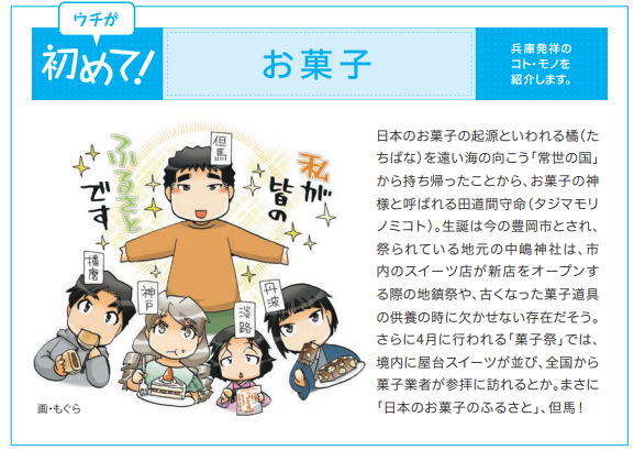 日本のお菓子の起源といわれる橘(たちばな)を遠い海の向こう「常世の国」から持ち帰ったことから、お菓子の神様と呼ばれる田道間守命(タジマモリノミコト)。生誕は今の豊岡市とされ、祭られている地元の中嶋神社は、市内のスイーツ店が新店をオープンする際の地鎮祭や、古くなった菓子道具の供養の時に欠かせない存在だそう。さらに4月に行われる「菓子祭」では、境内に屋台スイーツが並び、全国から菓子業者が参拝に訪れるとか。まさに「日本のお菓子のふるさと」、但馬!