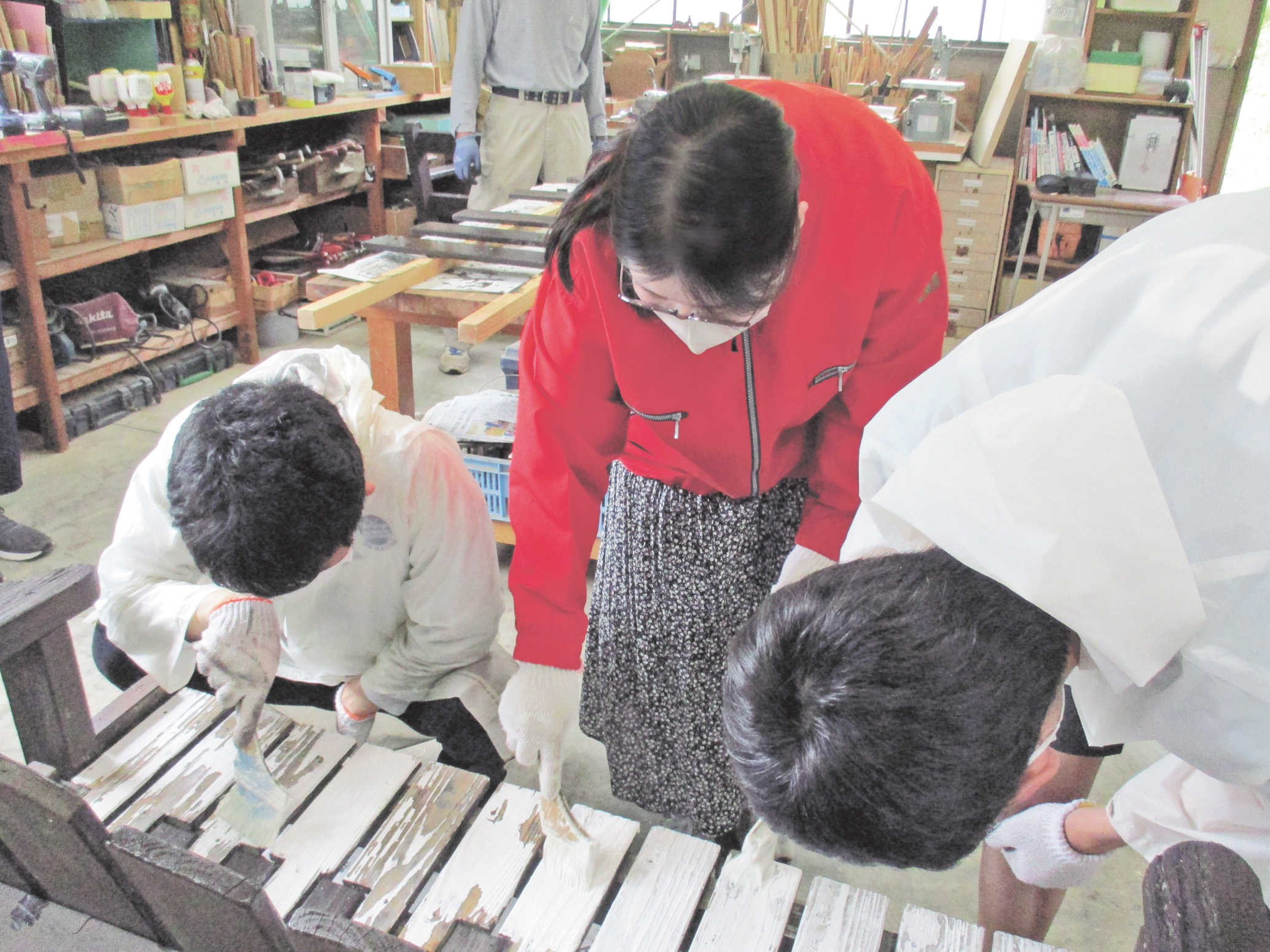 野外制作のプログラムで、力を合わせてベンチを手作り。 |