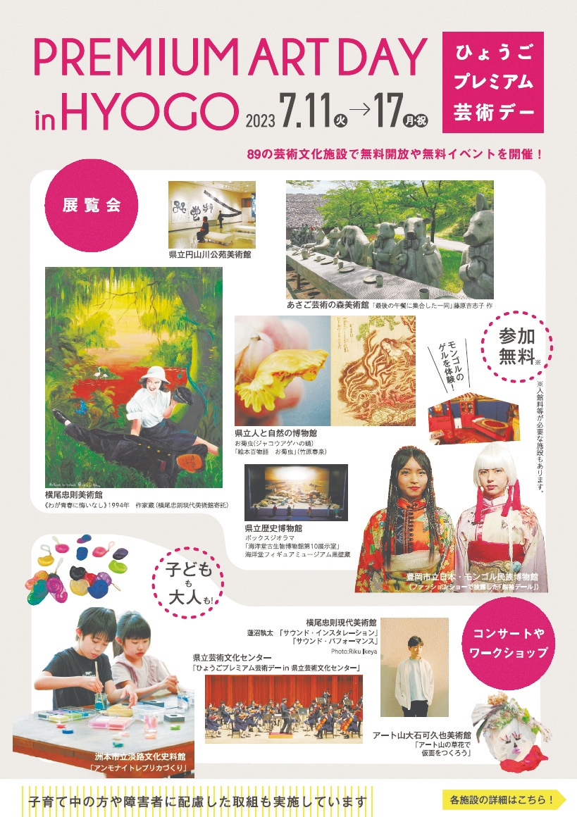 県内の芸術文化施設で展覧会の無料開放や無料イベントを実施する「ひょうごプレミアム芸術デー」を7月11日(火曜日)から1週間開催します。昨年の県立9施設から、今年は市町や民間の施設も加わり全89施設に。県立施設では「誰もが鑑賞しやすい環境づくり※」を掲げ、障害者や子ども連れの人を優先的に案内したり、自由に会話できる時間帯を設けたりします。また、触れる展示や手話による作品解説、字幕付き映像の上映も予定。一時保育もあります。ぜひ、多くの施設を巡り、気軽に芸術文化に触れてください。(県芸術文化課)