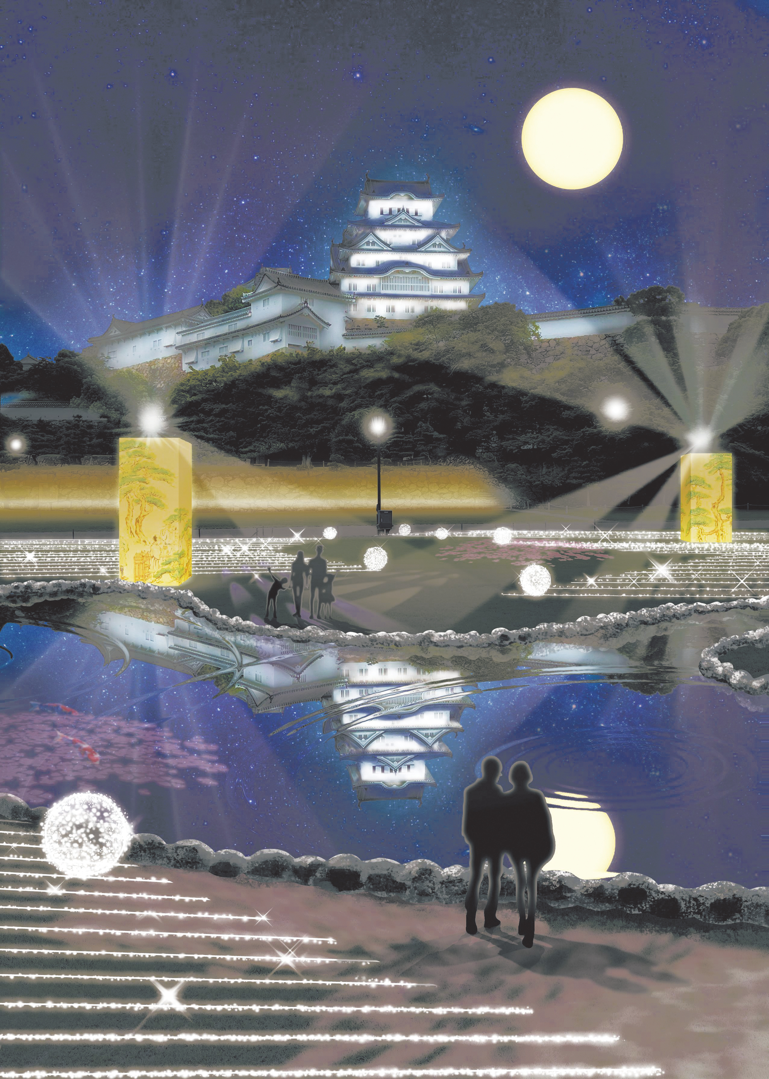 国宝姫路城では、日本初の世界文化遺産に登録されて30周年を迎えたことを記念し、三の丸広場でイルミネーションイベント「鏡花水月」を開催中です。広場に水盤を置いて、江戸時代にあったとされる庭園の池を再現。“逆さ天守”が映り込む水面にプロジェクションマッピングで水の波紋や雪の結晶を投影するなど、幻想的な世界を創出します。また、世界遺産登録日である12月11日(月曜)には祝賀イベントも実施します。ぜひ、ご来城ください。