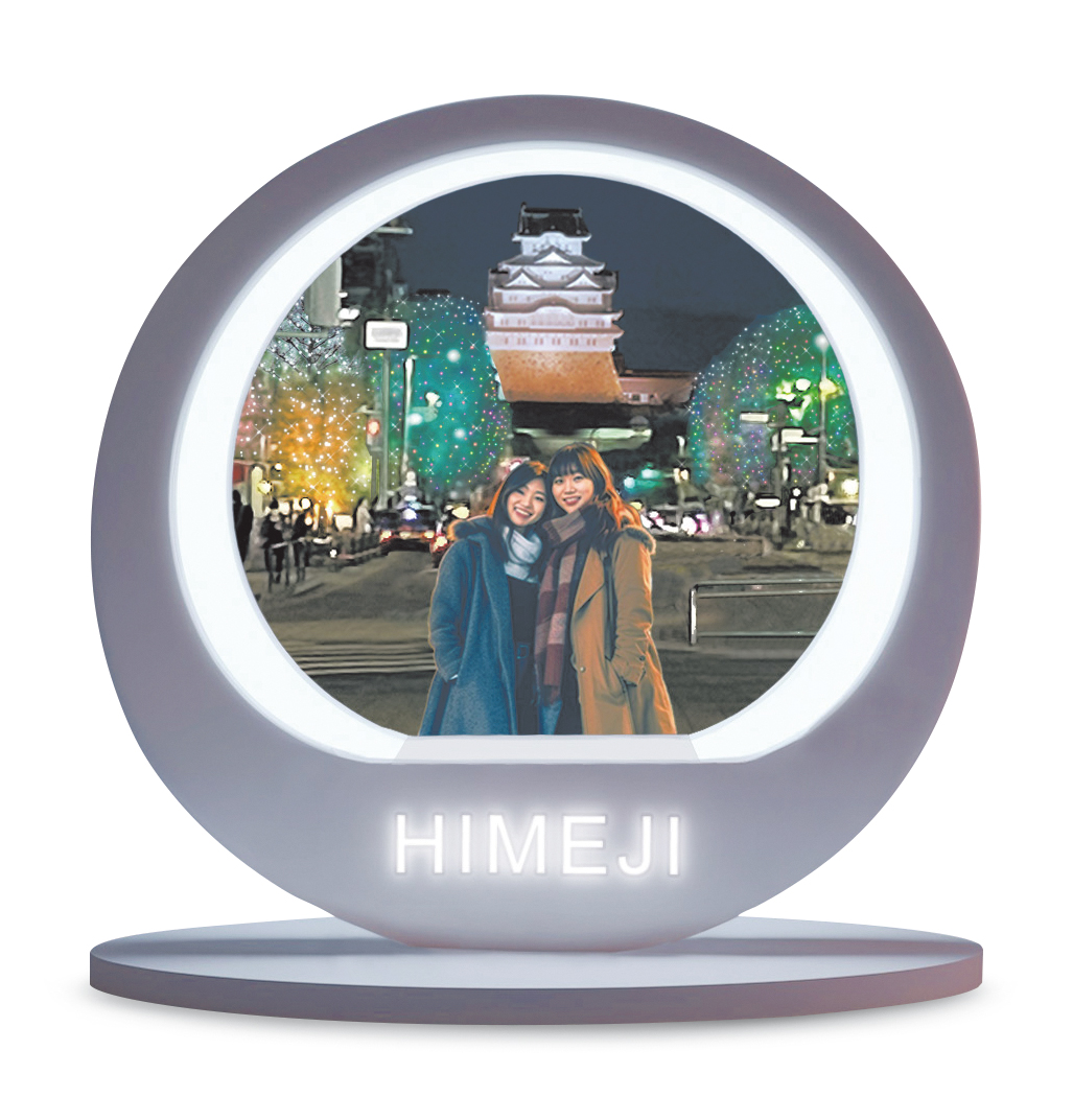 姫路城をバックに記念ボードを持った姿をポラロイドカメラで撮影し、メッセージを記入。写真と30周年記念品を進呈します。