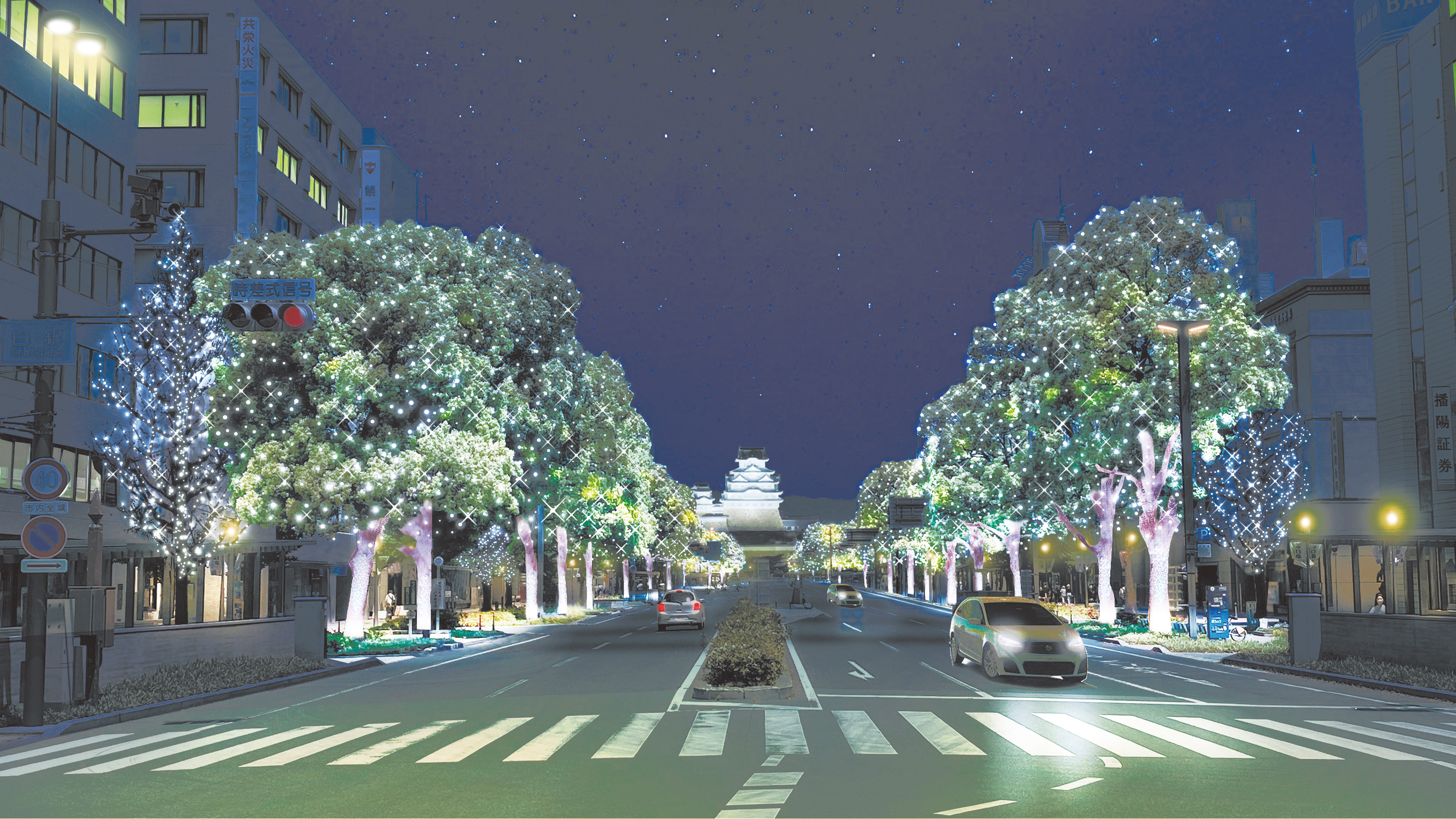 JR姫路駅から姫路城へと延びる大手前通りでも、24年2月29日(木曜)までイルミネーションを実施。特製モニュメントも設置されます。