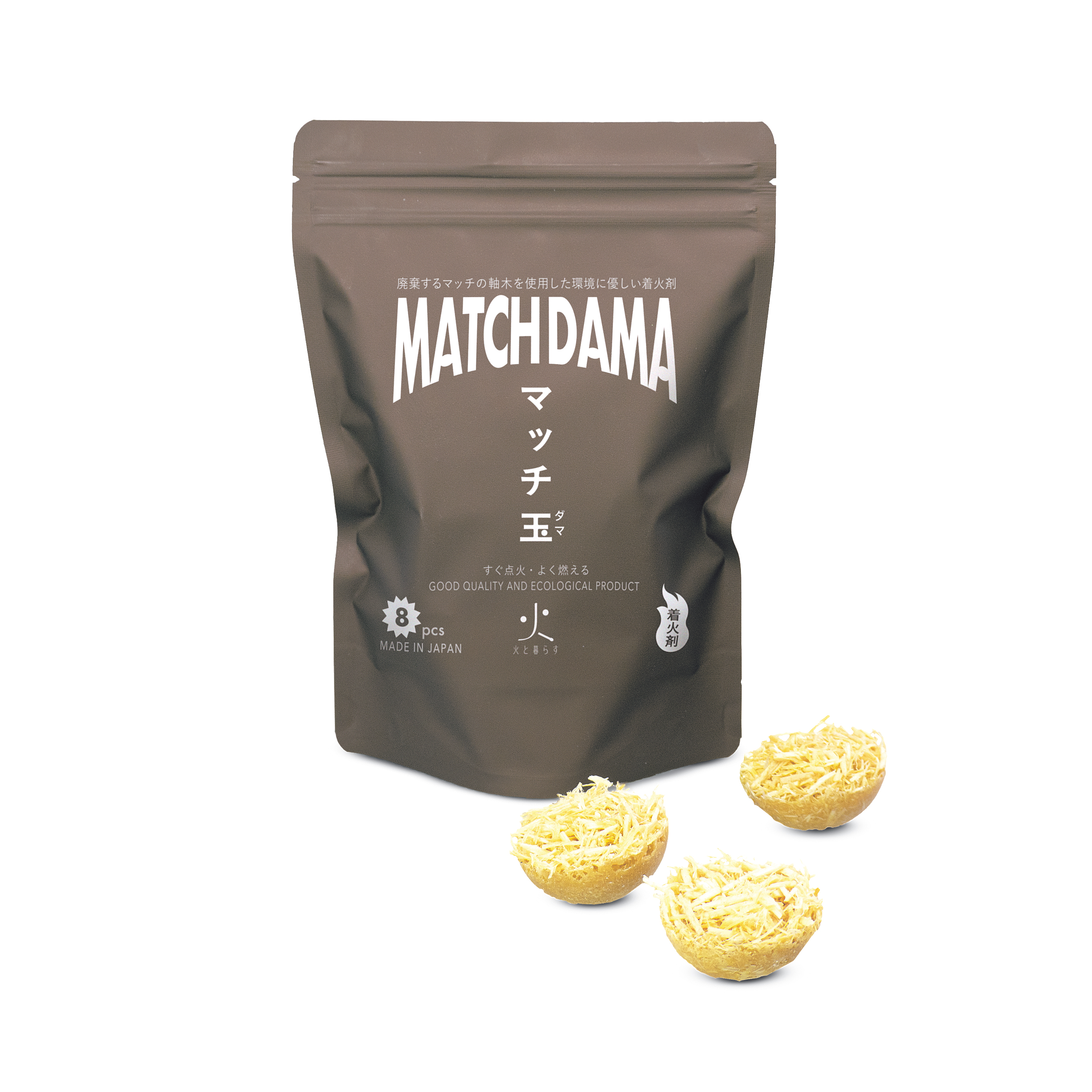 廃棄されるマッチの軸木が主材料で、災害時の火起こしにも役立つ着火剤。