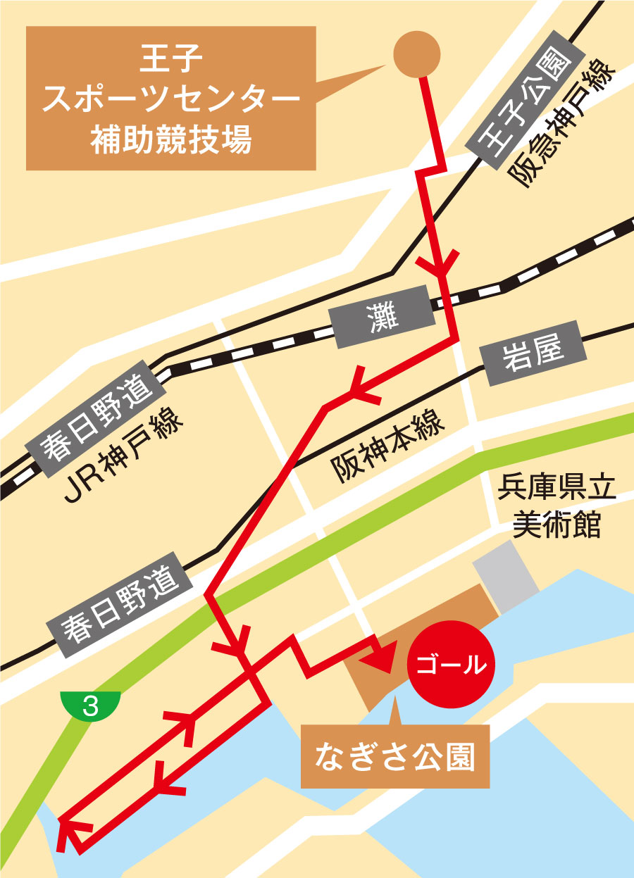 神戸市立王子スポーツセンター補助競技場からHAT神戸・なぎさ公園まで約4kmのウオーキング。