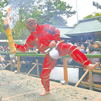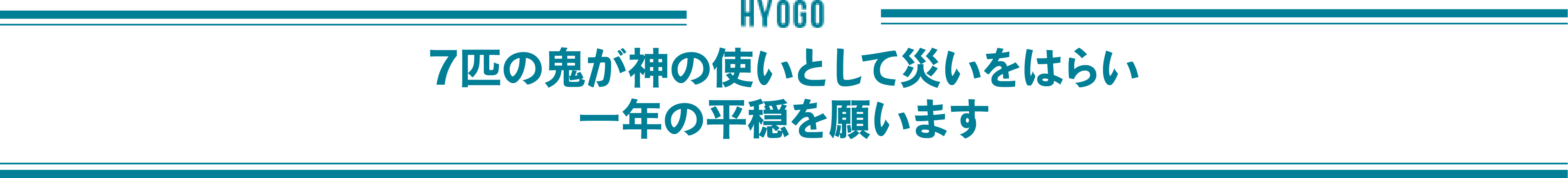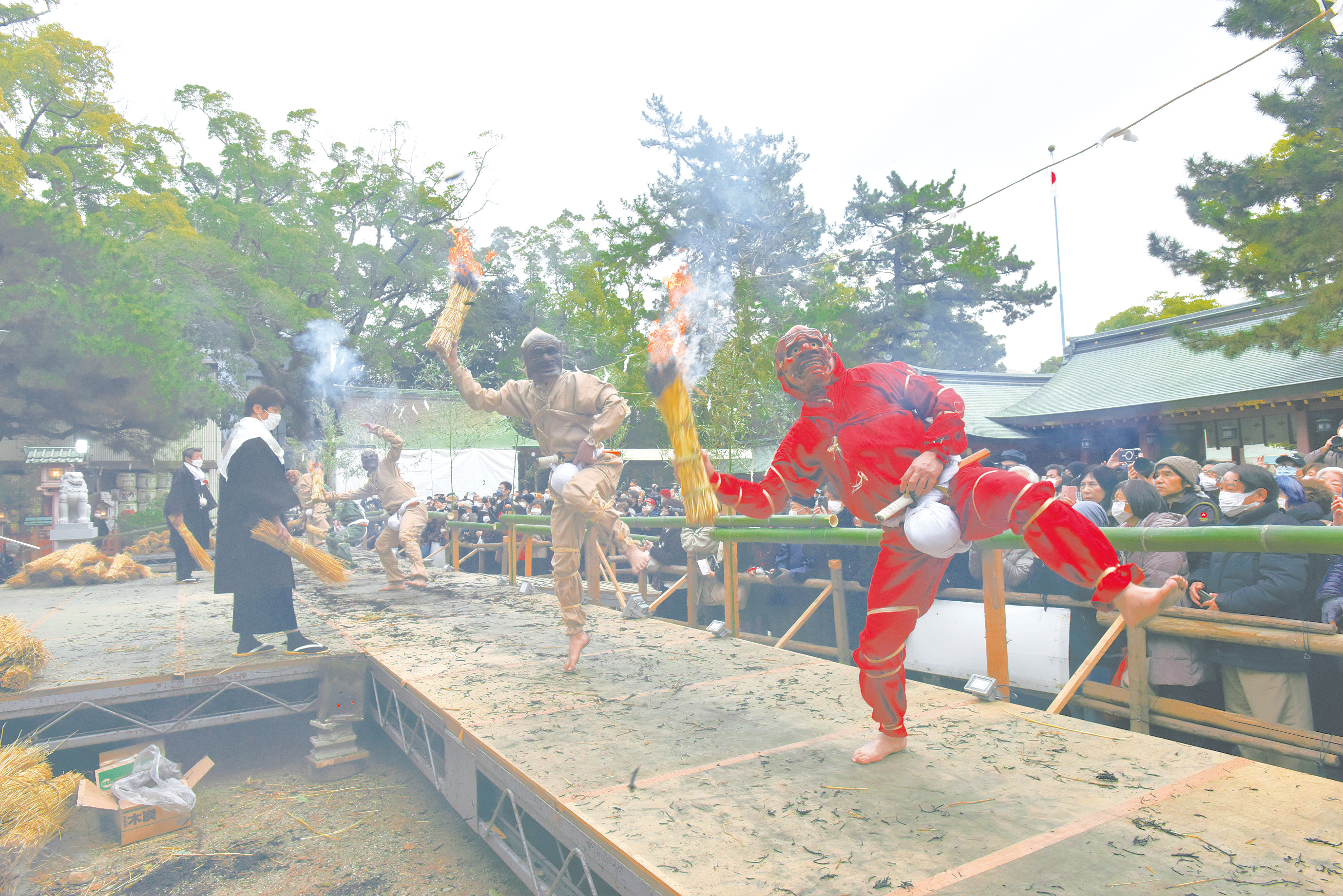 長田神社では毎年節分に、県重要無形民俗文化財に指定されている古式追儺(ついな)式を行います。鬼は悪者と思われがちですが、この儀式では神の使いとされ、豆まきはしません。一家の大黒柱である「餅割鬼」、妻の「尻くじり鬼」、長男の「一番太郎鬼」という家族に、乳母役の「姥(うば)鬼」などを加えた7匹の鬼が、たいまつで災いを焼いたり太刀で凶事を切ったりする踊りで一年の無病息災、家内安全を祈願します。鬼役は神事の前に井戸水を浴び、須磨の海に入ってみそぎを行います。大変な荒行を経て挑む踊りは気迫が感じられ、見応えがあります。参拝者はたいまつの燃え残りを玄関に飾ると、福を招くといわれています。迫力満点の鬼たちを生で見て、厄をはらい、良い一年にしていただきたいです。(長田神社追儺式奉賛会 西本隆一さん)