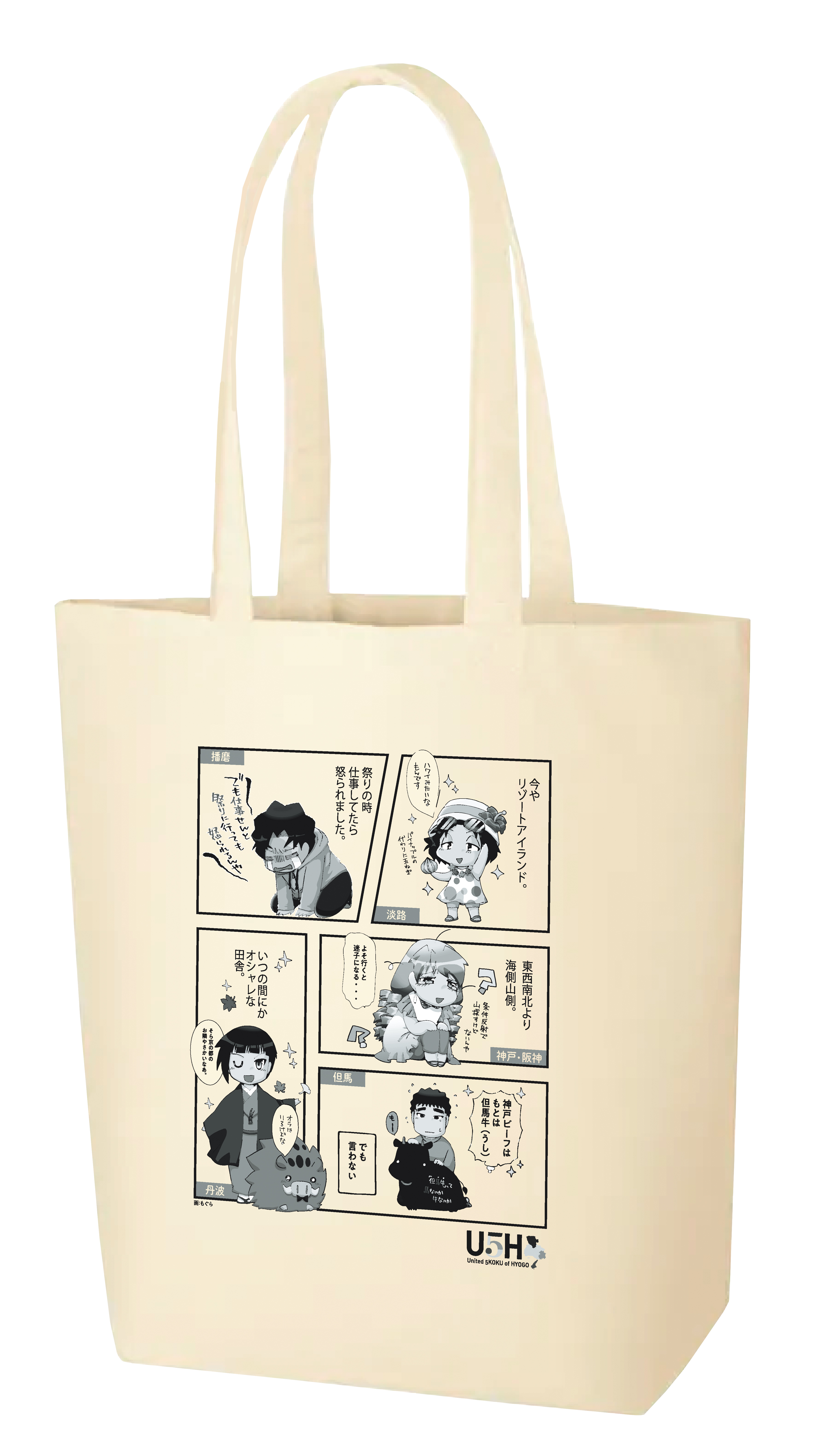 兵庫五国の特性を擬人化したキャラクターをプリントしたバッグ。横360mm×高さ370mm×マチ110mm。