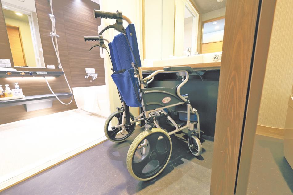 年齢や障害の有無などにかかわらず誰もが気兼ねなく旅行できるユニバーサルツーリズムの推進に向けて、「ひょうごユニバーサルなお宿」宣言・登録制度により宿泊施設のバリアフリー改修の費用などを支援しています。事業を活用した南あわじ市の観光旅館を視察し、専門家の点検・助言の下に改修した箇所を確認。バリアフリー化による移動や設備利用面での効果を体感しました。今後も取り組みを県内で展開し、インクルーシブな社会※づくりの輪を兵庫から広げていきます。