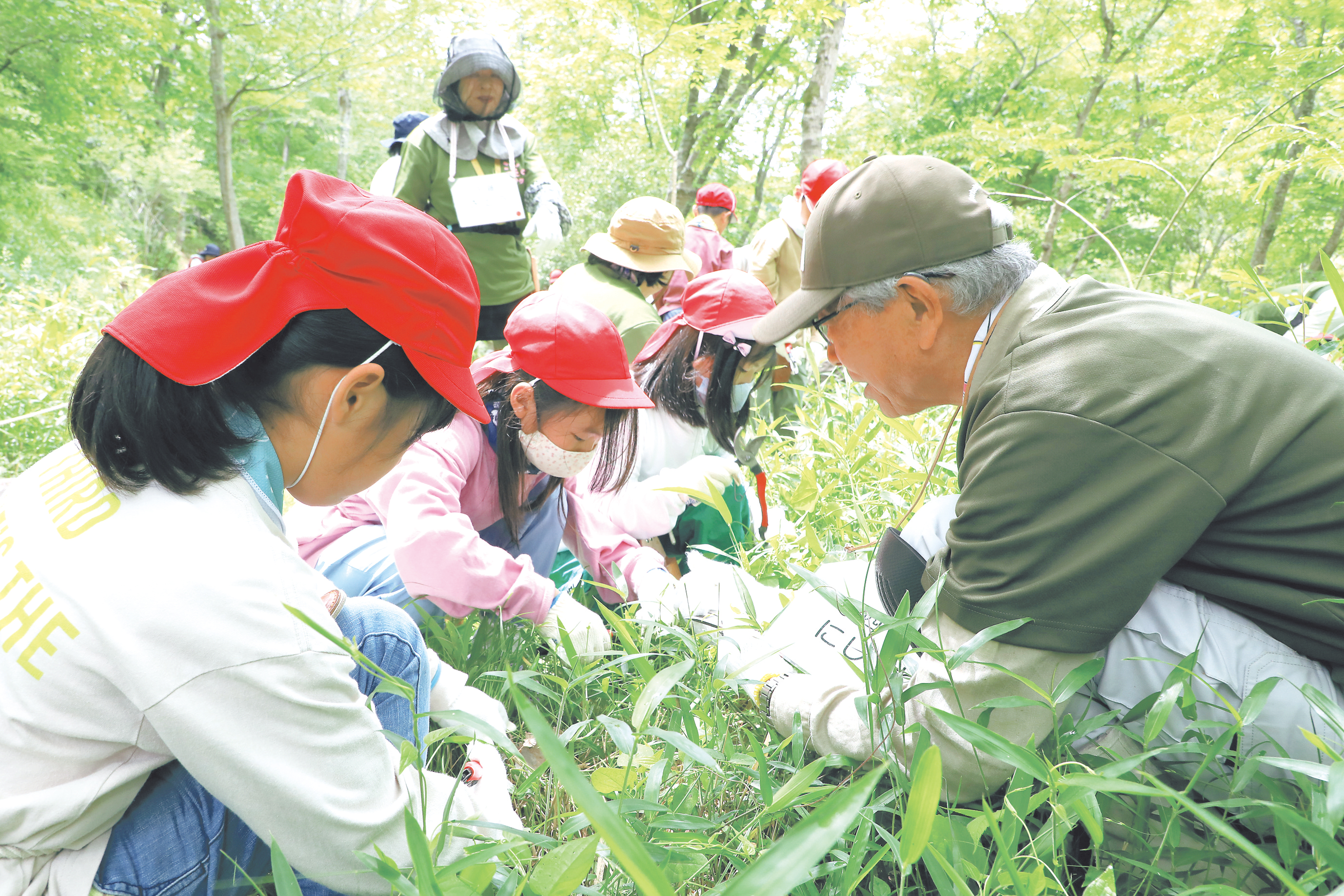 ササを刈る子どもに、はさみの使い方をアドバイス(右が西澤さん)。