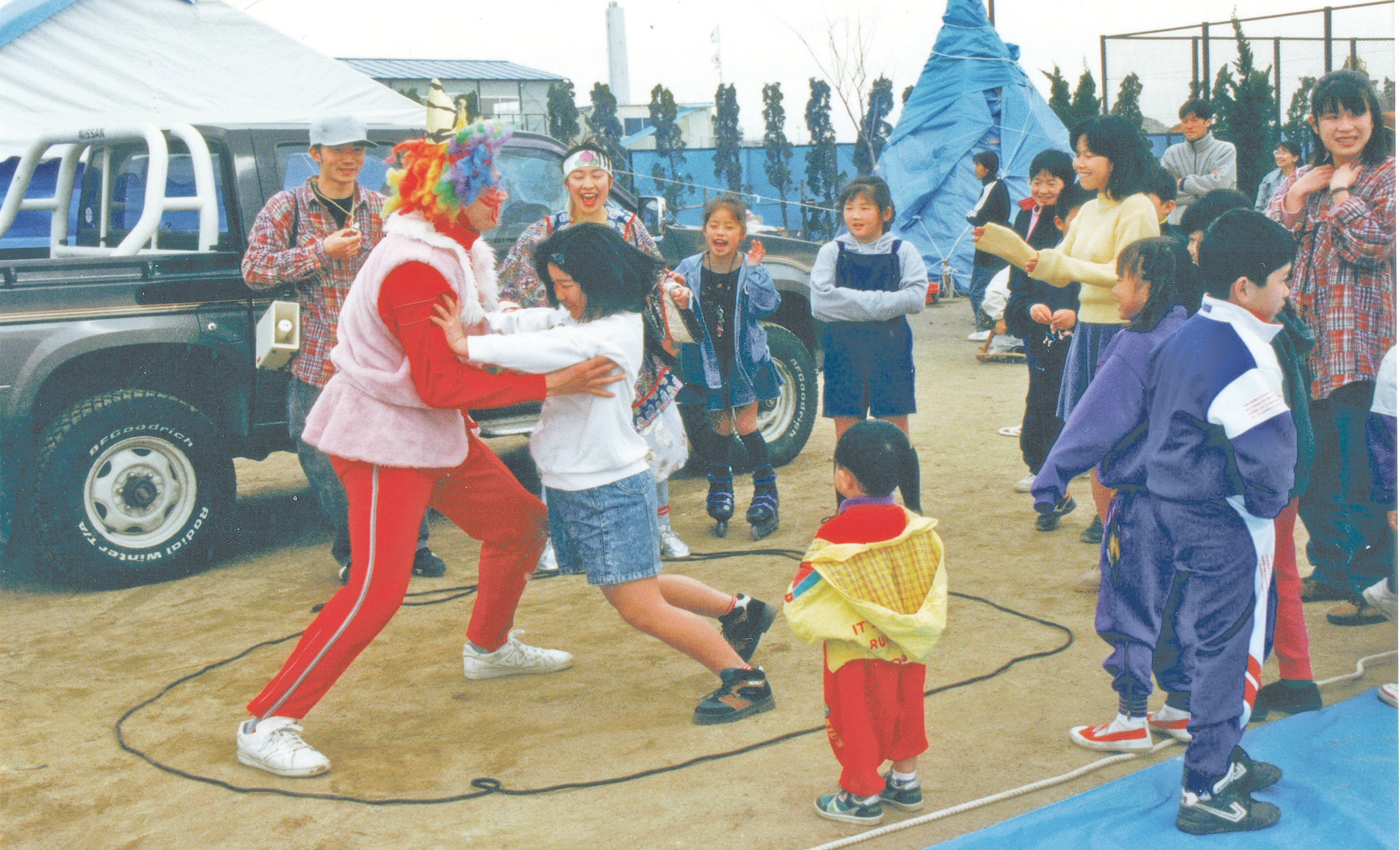 阪神・淡路大震災時の避難所での激励公演「ももたろう」では、子どもたちと相撲を取る場面も。