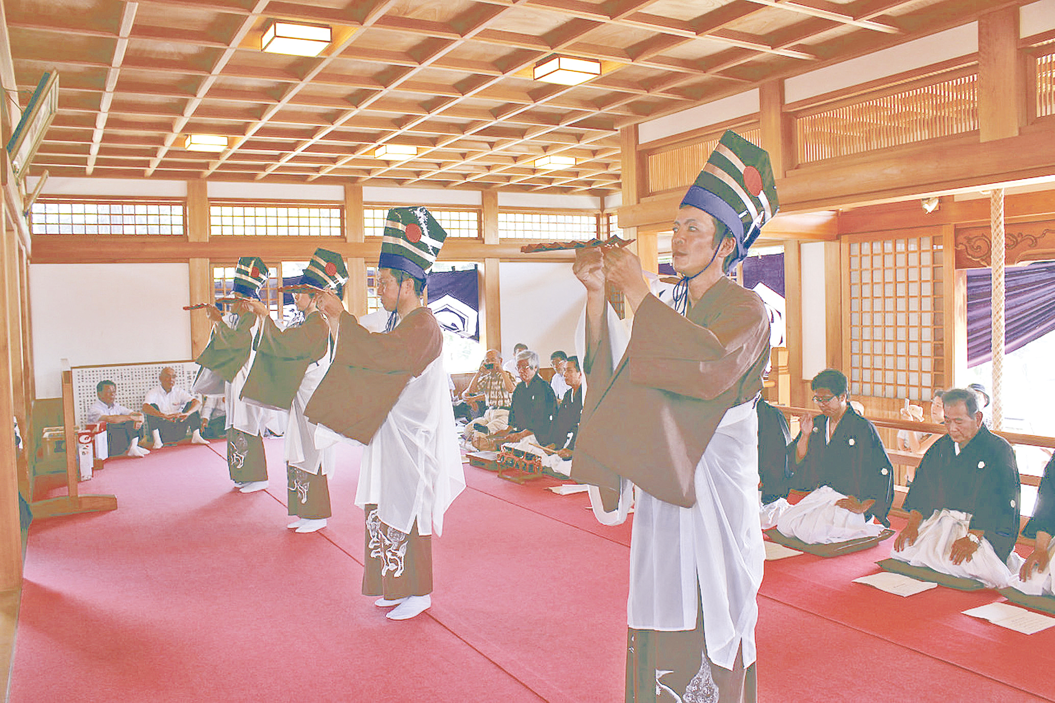 ユネスコ無形文化遺産登録を記念して昨年、境内で披露。大踊は白木綿の着物に黒帯、紫のたすきの衣装で行います。
