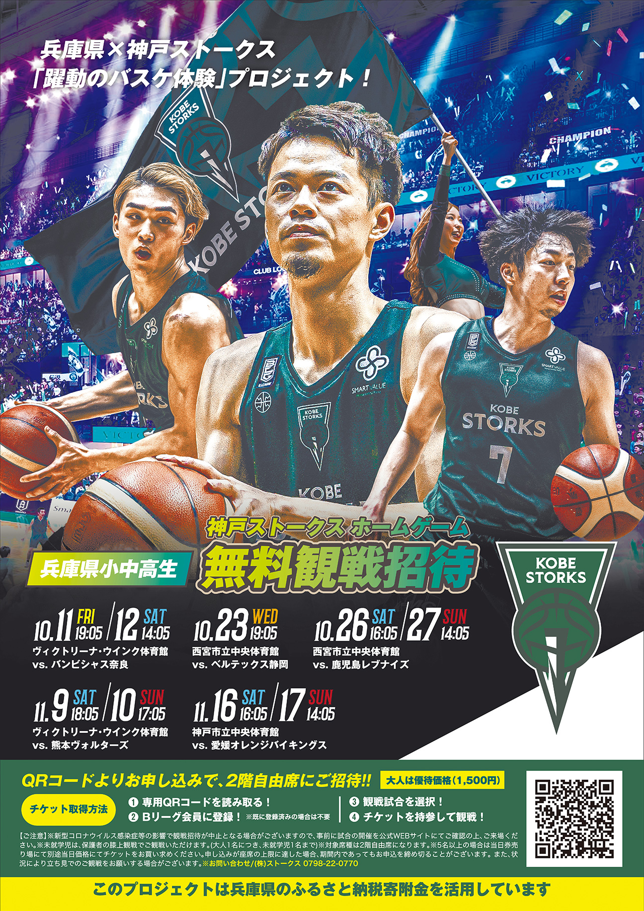 神戸ストークスとINAC神戸レオネッサの下記の試合を県内の小中高生は無料で観戦できます。