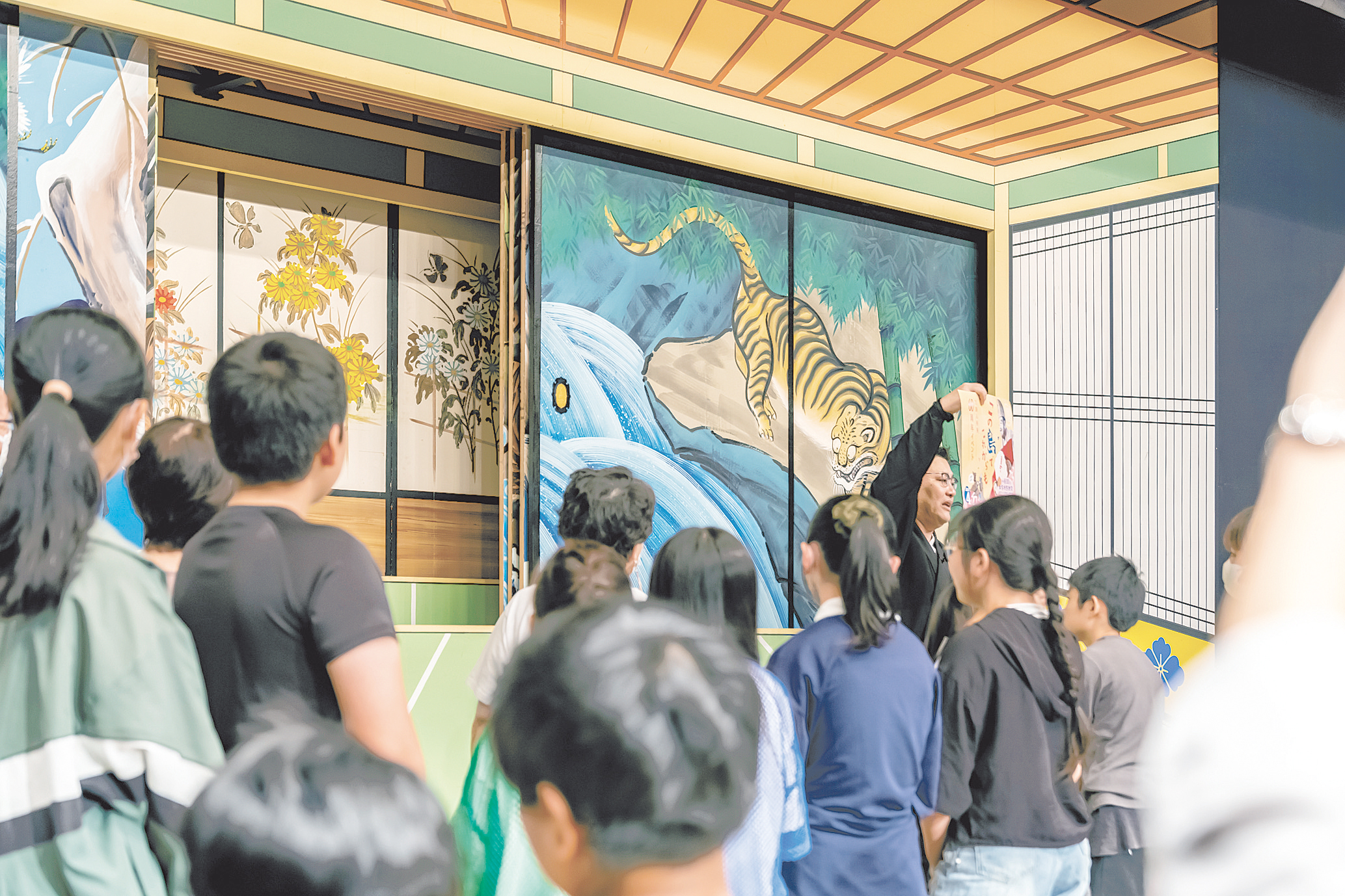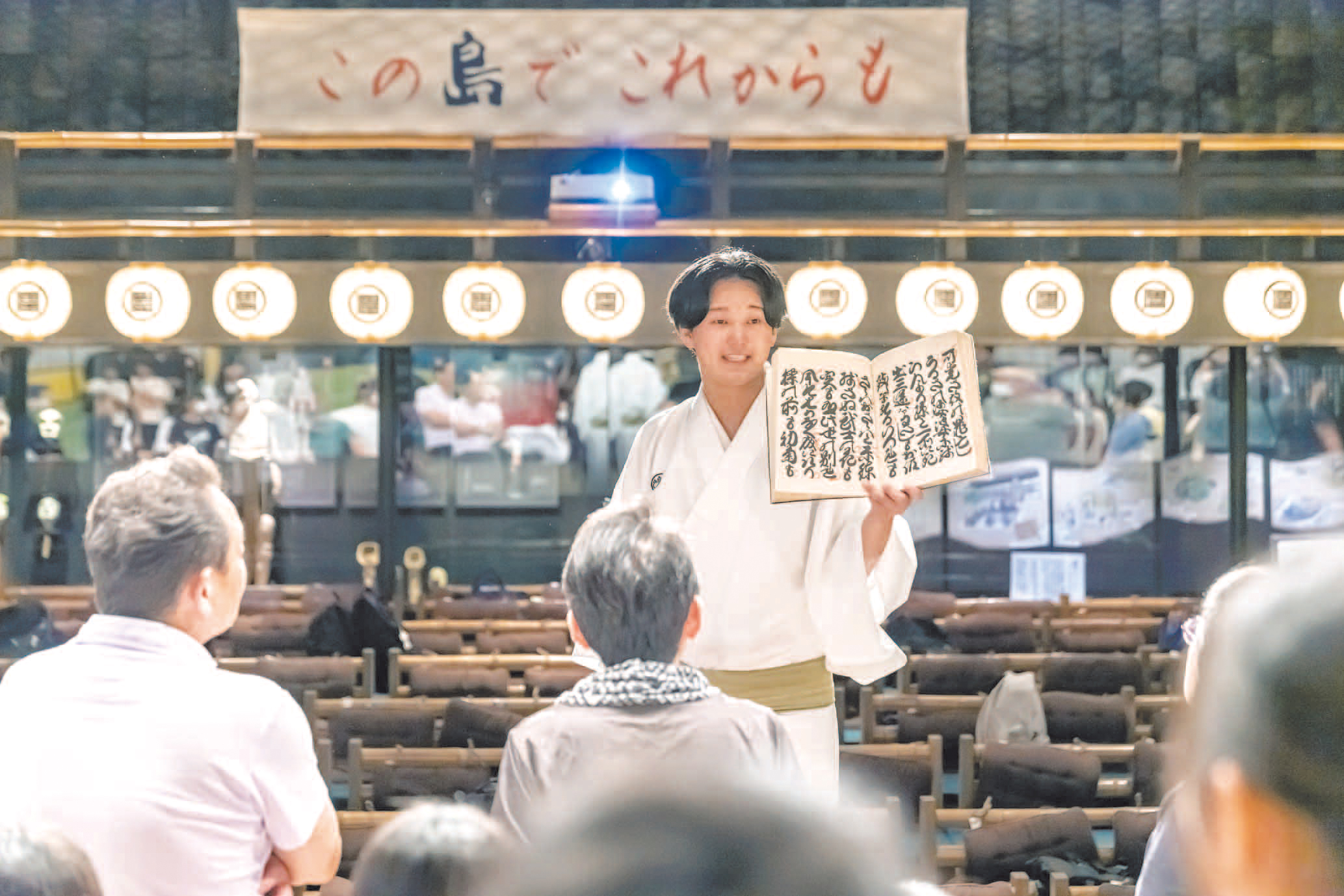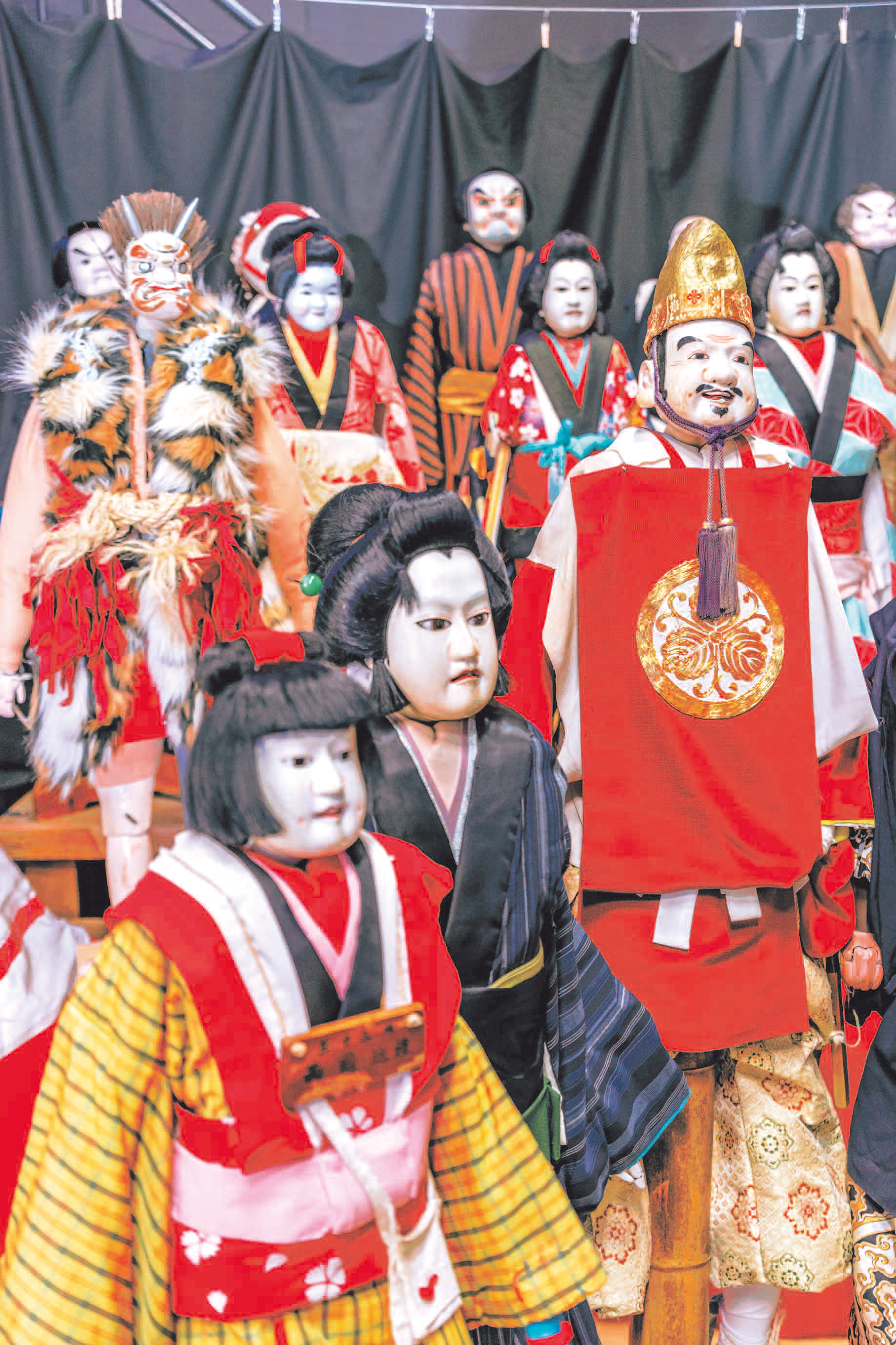 淡路人形座は1964(昭和39)年、室町時代から続く淡路人形浄瑠璃の保存・継承を目的に発足し、現在は専用劇場で1日に4回の公演をしています。人気演目の「戎(えびす)舞(まい)」では、上演前にバックステージツアーと人形解説を実施。舞台背景のふすま絵が次々に変わり千畳敷の大広間になっていく“大道具返し”の実演や、1体の人形を3人で操作する方法の紹介をします。舞台で特に注目してほしいのが、まるで魂が吹き込まれたかのような人形の動きです。首のかしげ方やまばたき、手振りで喜怒哀楽を情緒豊かに表現し、見る者を物語の世界へぐっと引き込みます。(淡路人形座 吉田徳蔵さん)
