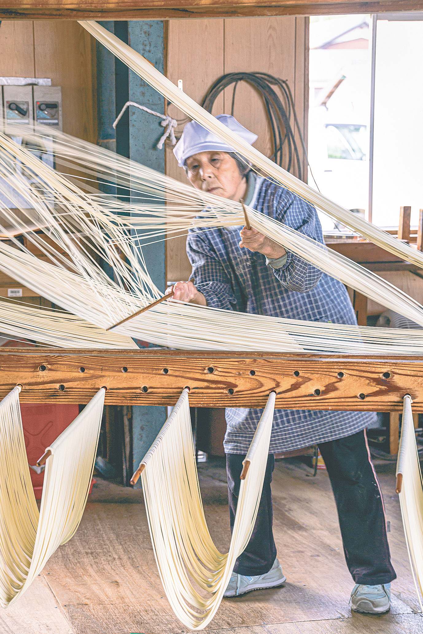 南あわじ市内11カ所の製麺所で製造される淡路島手延べそうめんは、国内流通量の1%にも満たない上に各社が独自に販売していることから、“幻のそうめん”といわれています。昔ながらの手作業で延ばす麺は細くてこしがあり、のど越しの良さが自慢です。天保年間(1830年~44年)、福良の漁師だった私の祖先が伊勢参りの帰りに奈良県「三輪そうめん」の技法を持ち帰ったのが始まり。雨が少なく冷たい季節風が吹く気候はそうめん作りに合い、漁業者の冬場の副業として広まりました。プログラムでは、生地を引き延ばして麺状にする作業などを体験してもらいます。これを機に、淡路島のそうめんを多くの人に知ってもらいたいです。(淡路手延素麺協同組合理事長 金山守良さん)