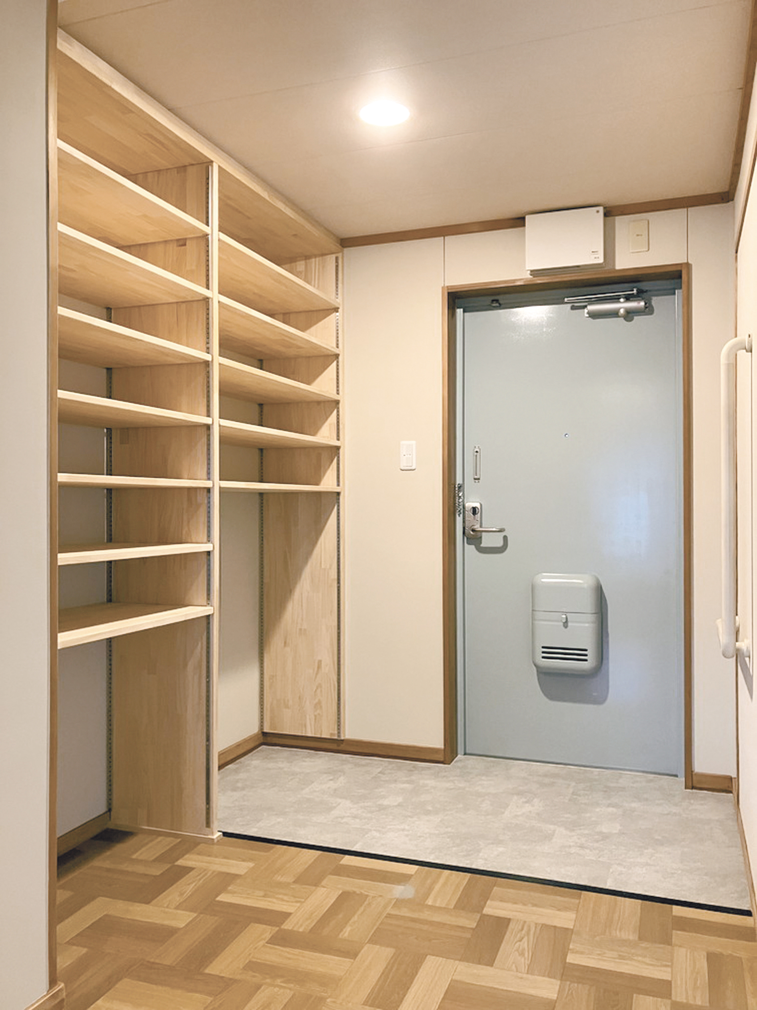玄関には可動棚を設置。ベビーカーを折り畳んで収納できます。