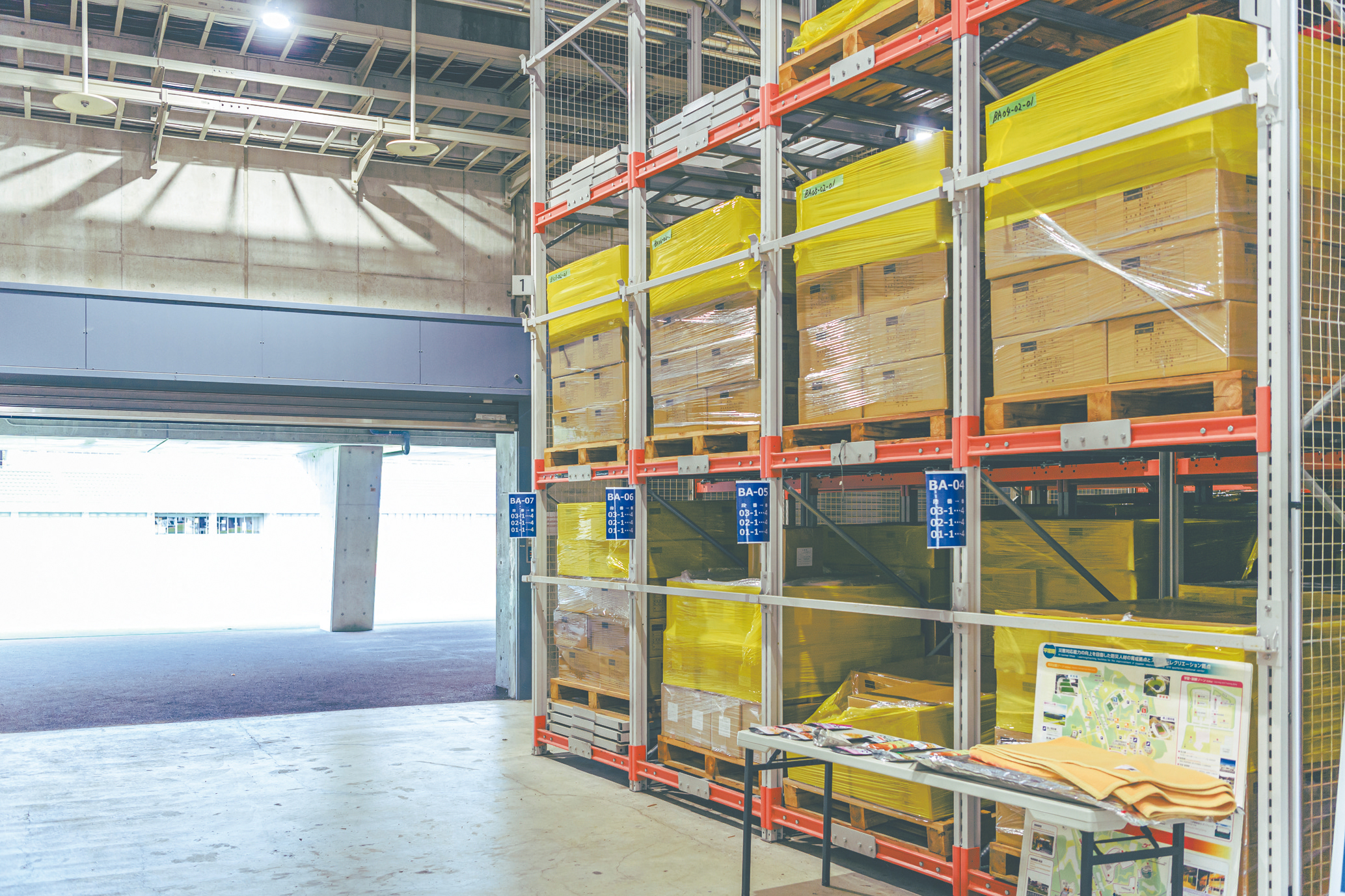 隣接する陸上競技場のスタンド下に約5,000平方メートルの備蓄倉庫を整備。食料、毛布などの生活用品、携帯トイレなどの衛生用品を黄、赤、青に色分けして保管しています。