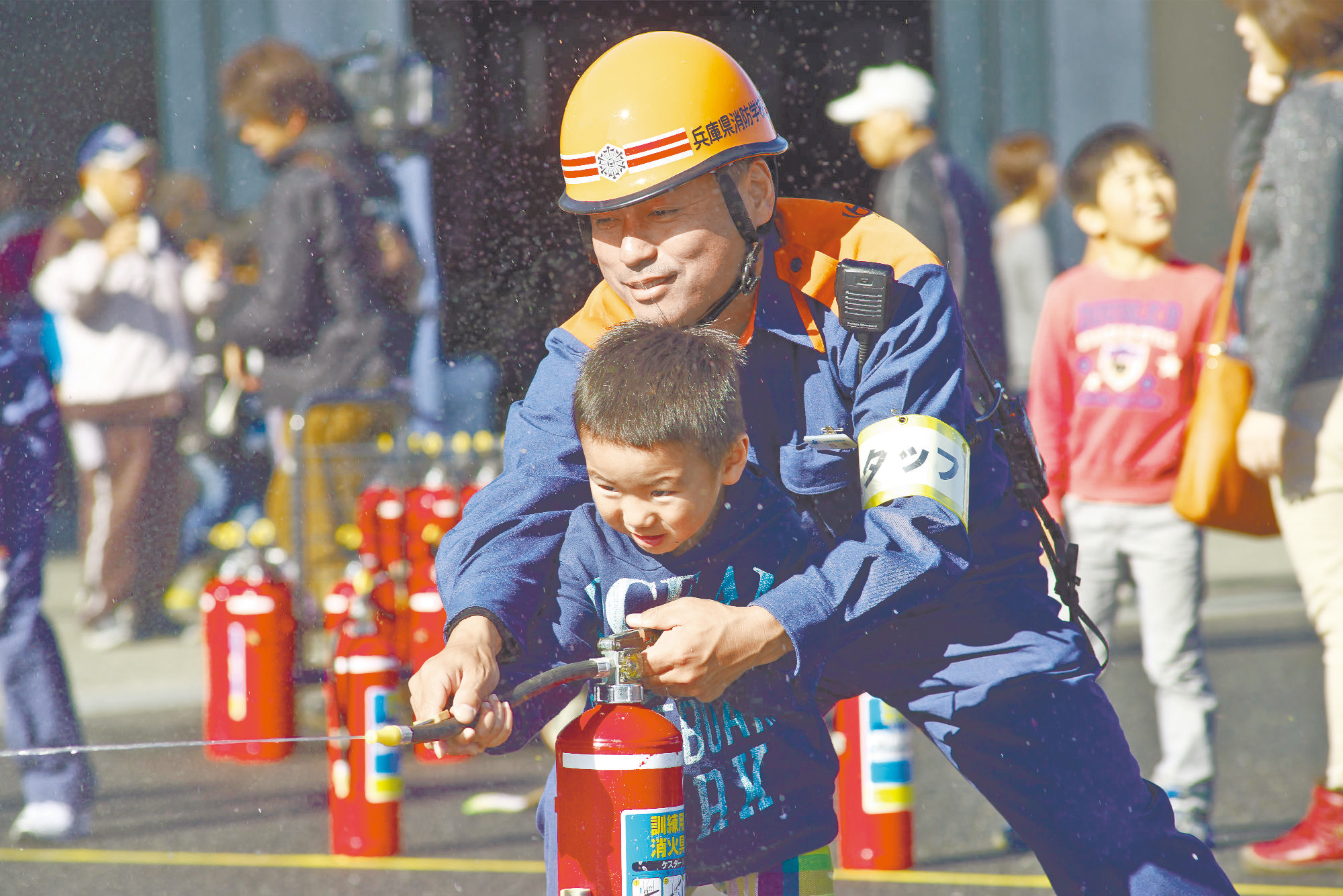 消火器の取扱方法を習って消火活動を体験。
