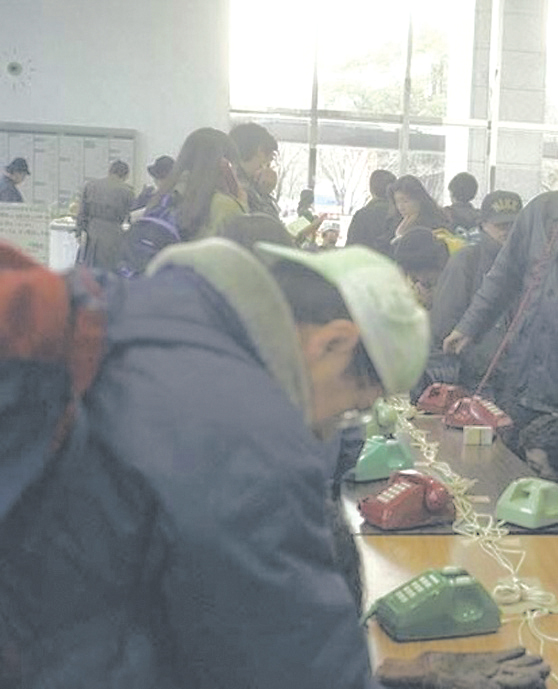 神戸市役所に設置された臨時の無料電話コーナーから電話をかける人たち(1995年2月5日大木本美通さん撮影、神戸大学附属図書館震災文庫所蔵)