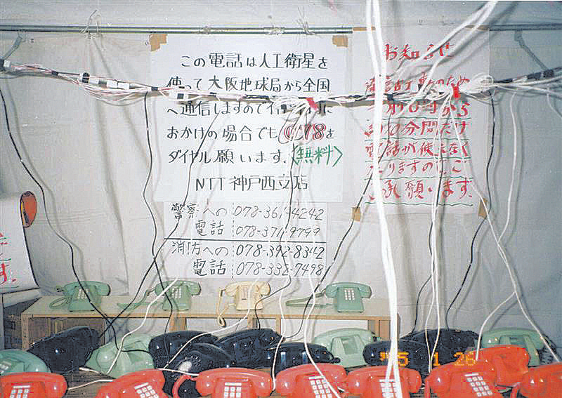 長田区役所前に設置された夜間特設公衆電話(1995年1月26日撮影、人と防災未来センター所蔵)