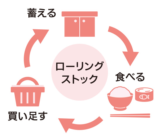 ローリングストックをご存じですか。普段食べている食品を多めに買って蓄え、食べた分を買い足していく備蓄方法です。例えば、1週間分の食料をまとめて買っておき、賞味期限の早いものから食べ、消費した分を買い足せば、常に1週間分の食料を備蓄できます。賞味期限切れを防げるため廃棄が少なくなり、SDGsにも貢献。日々の生活の中で、おいしく楽しく災害に備えましょう!